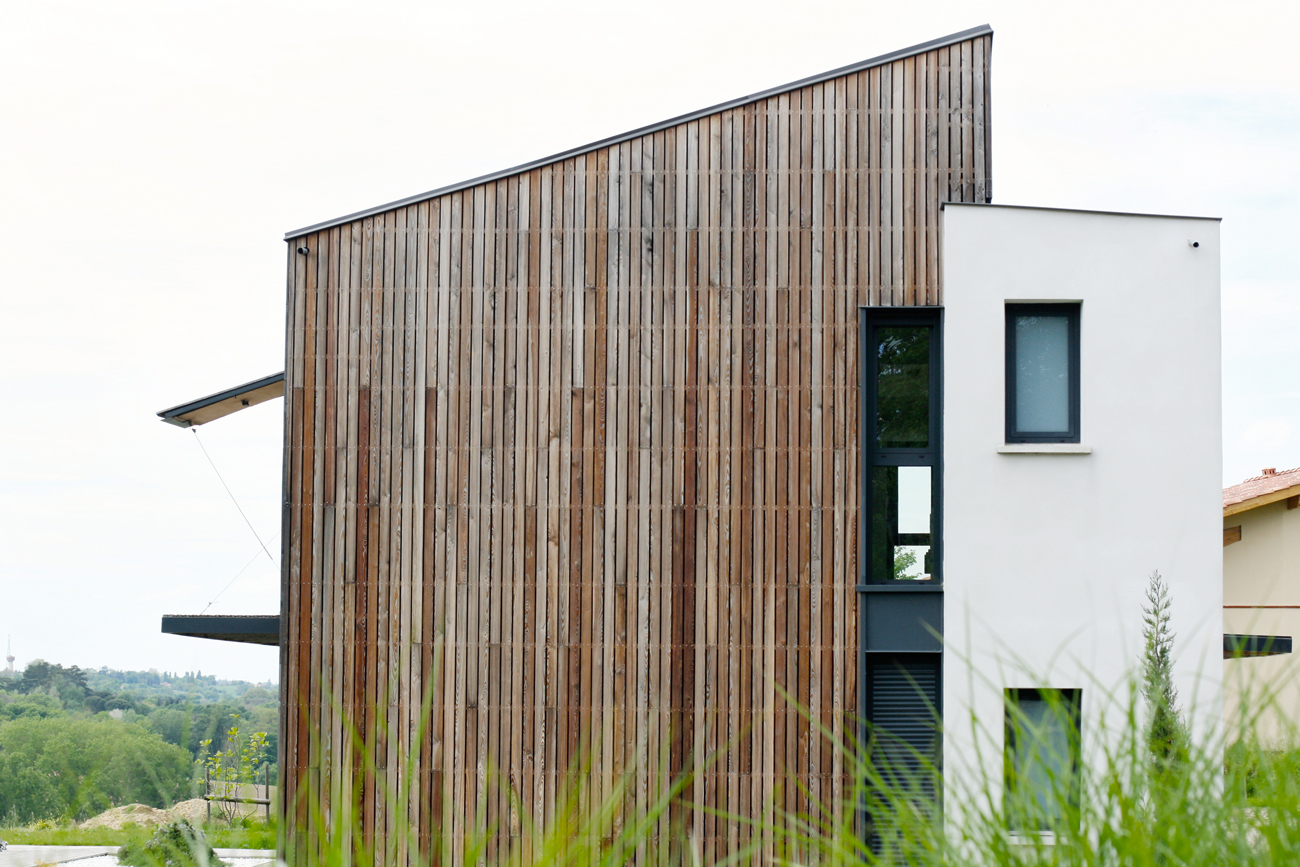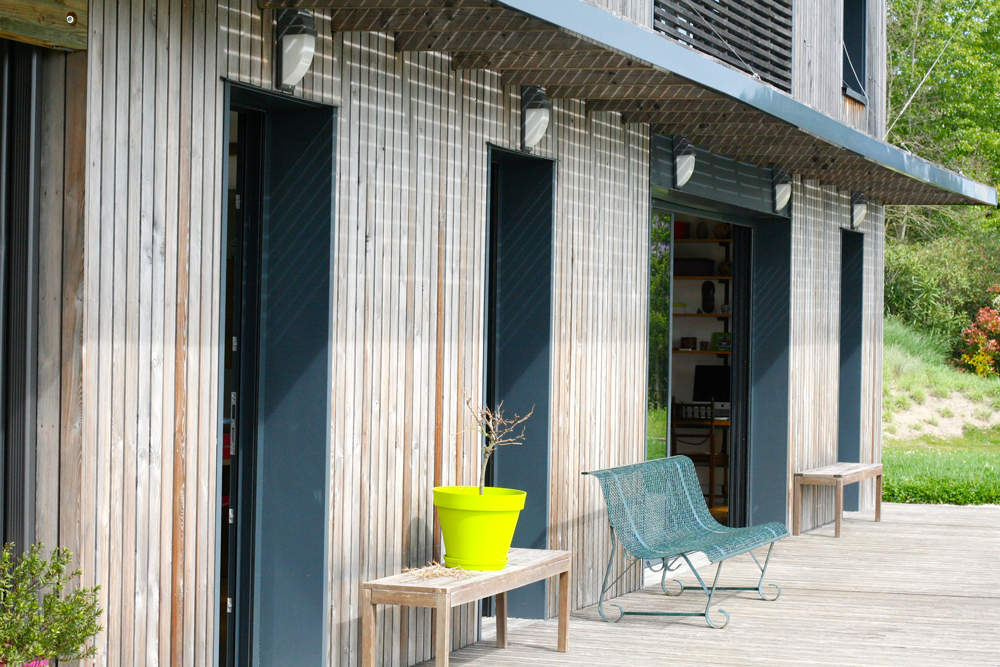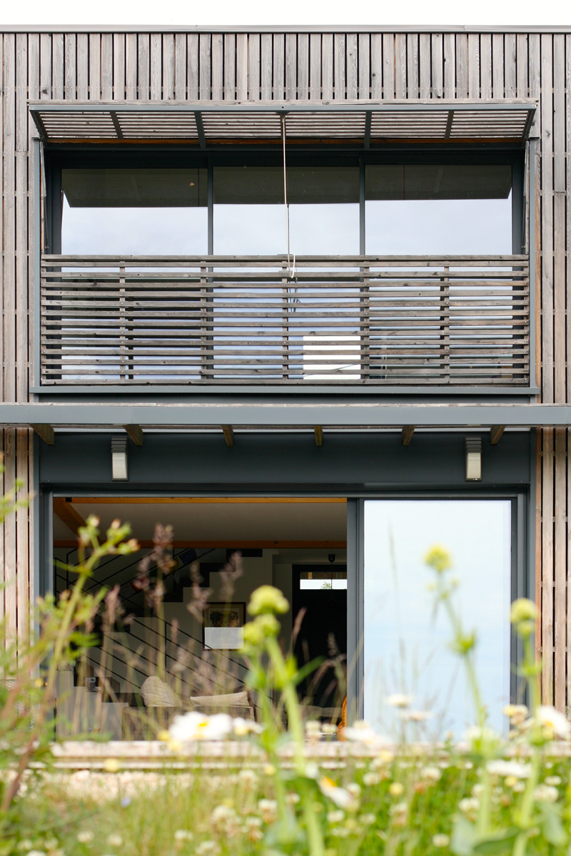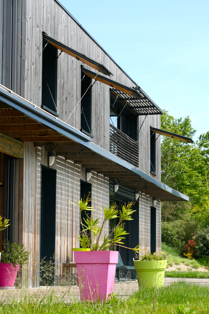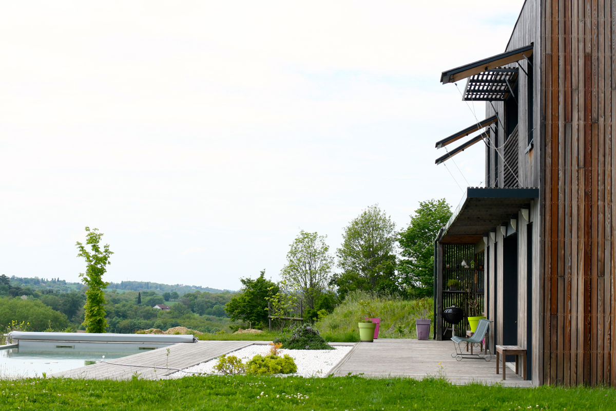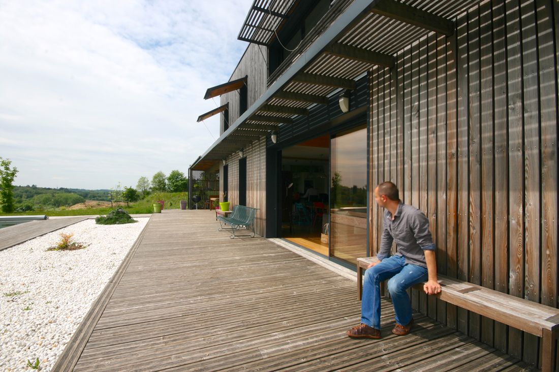Une large casquette vient protéger les vitrages en été et se prolonge en une large terrasse abritée. Ce projet de maison veut le bien-être de ses occupants tout en respectant l'environnement.