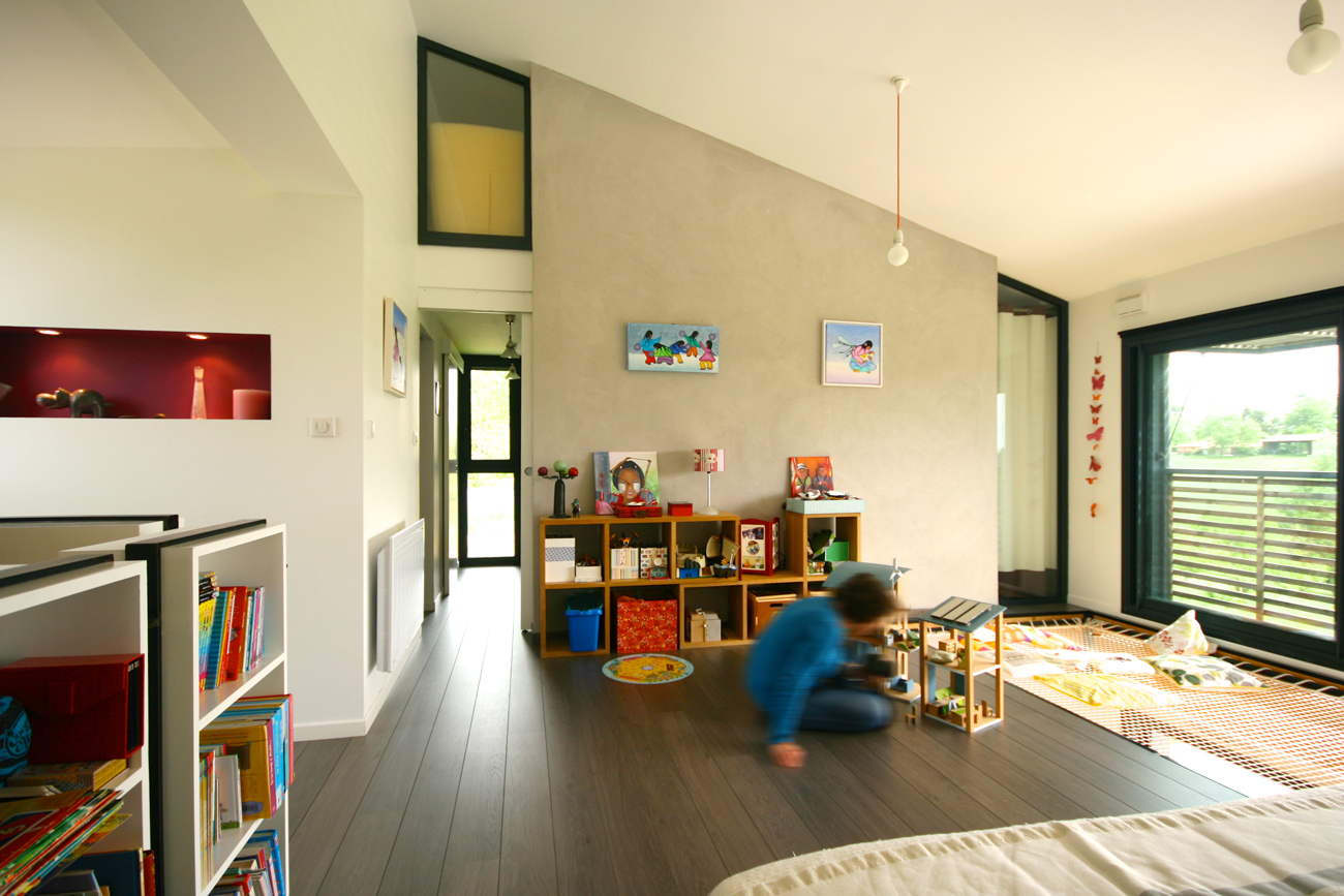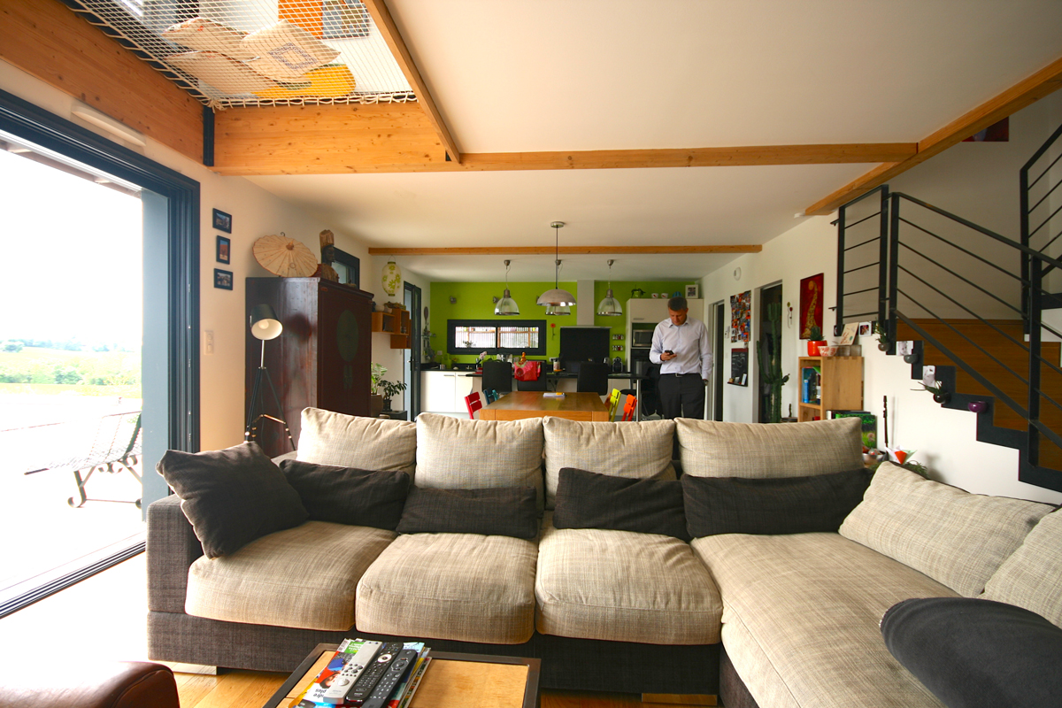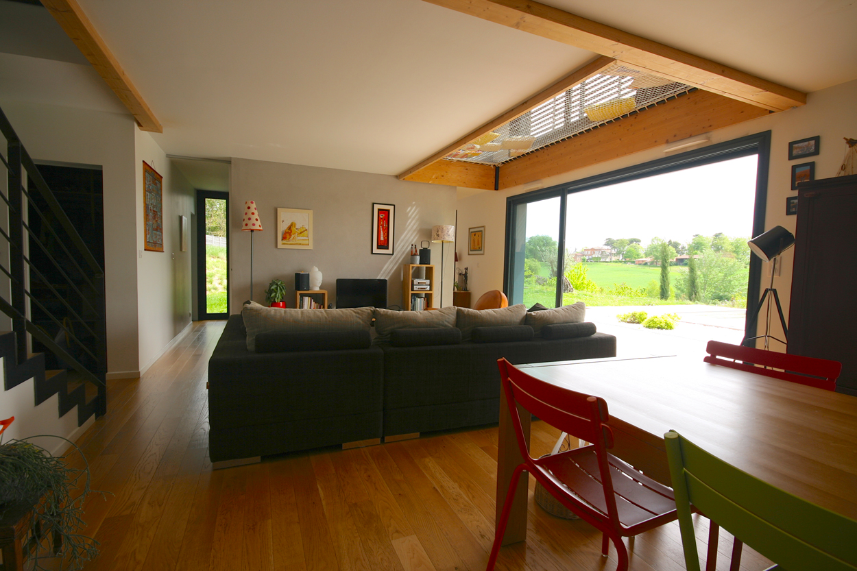 - Au Sud, un second volume en ossature bois accueille les pièces de vie et les chambres. Ces espaces sont largement vitrés au Sud afin de bénéficier des apports solaires en hiver, et de la vue sur le vallon.