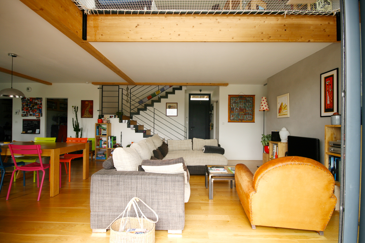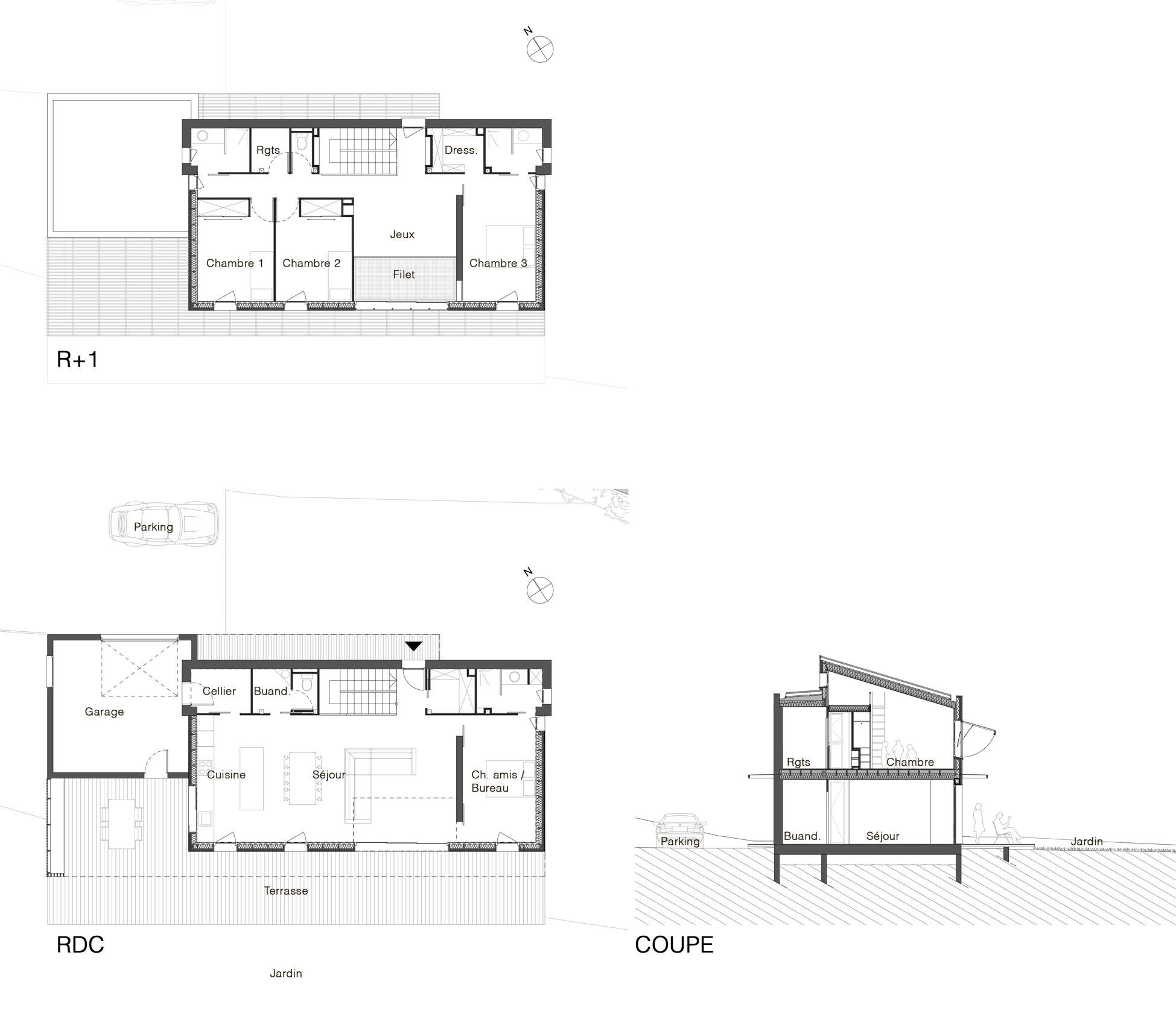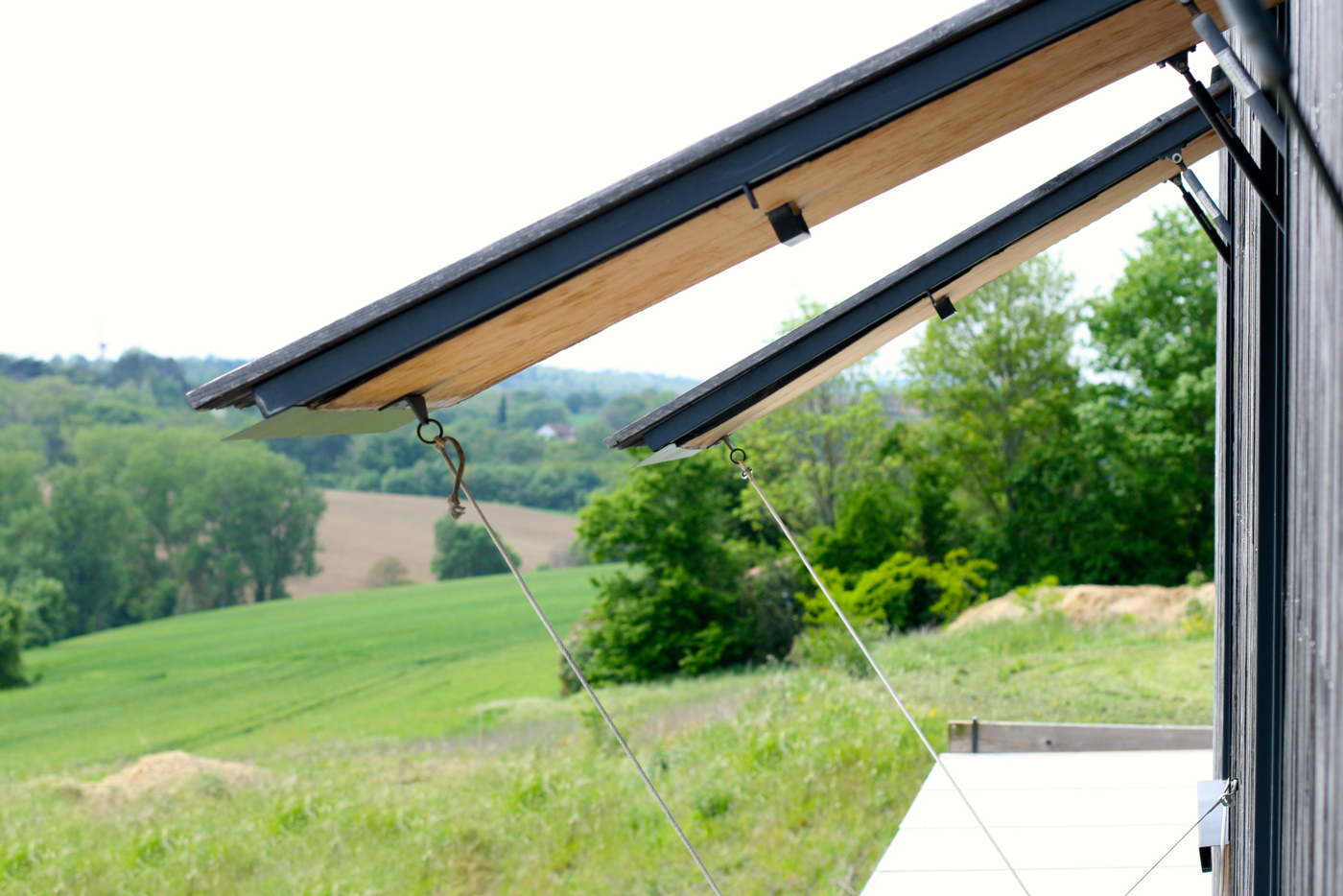 - Au Sud, un second volume en ossature bois accueille les pièces de vie et les chambres. Ces espaces sont largement vitrés au Sud afin de bénéficier des apports solaires en hiver, et de la vue sur le vallon.
