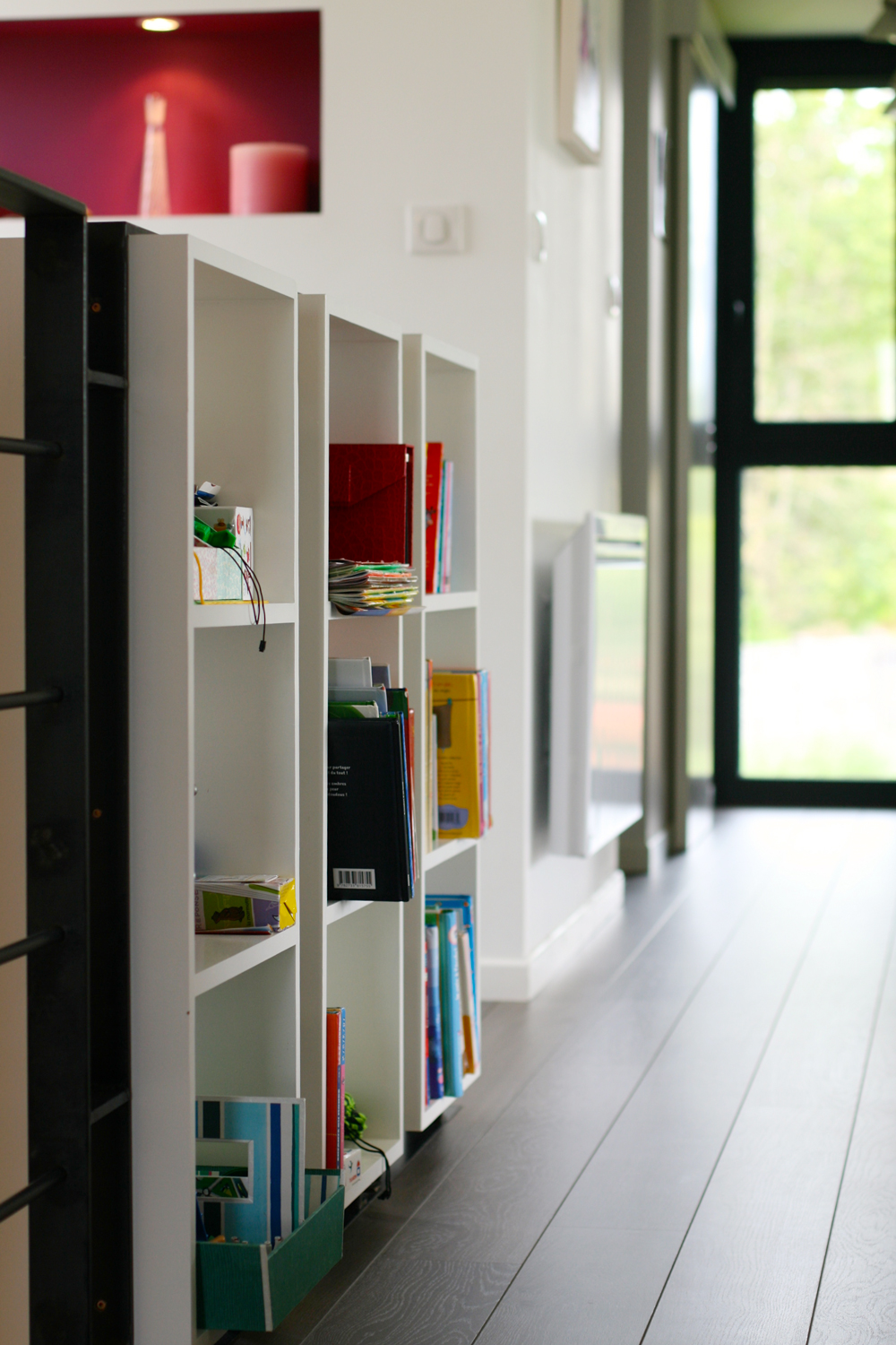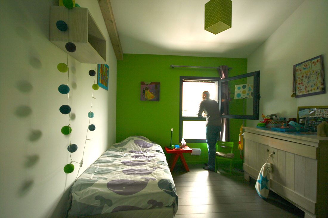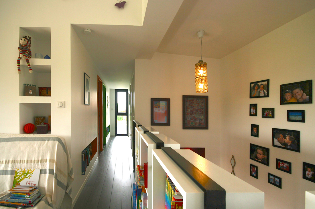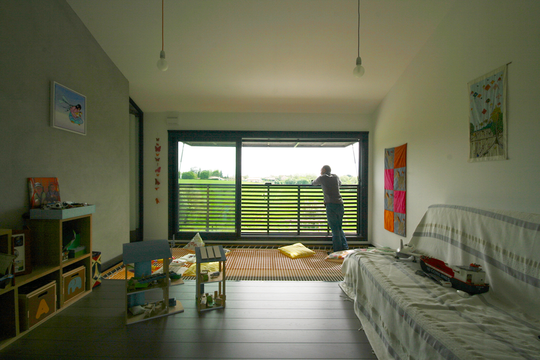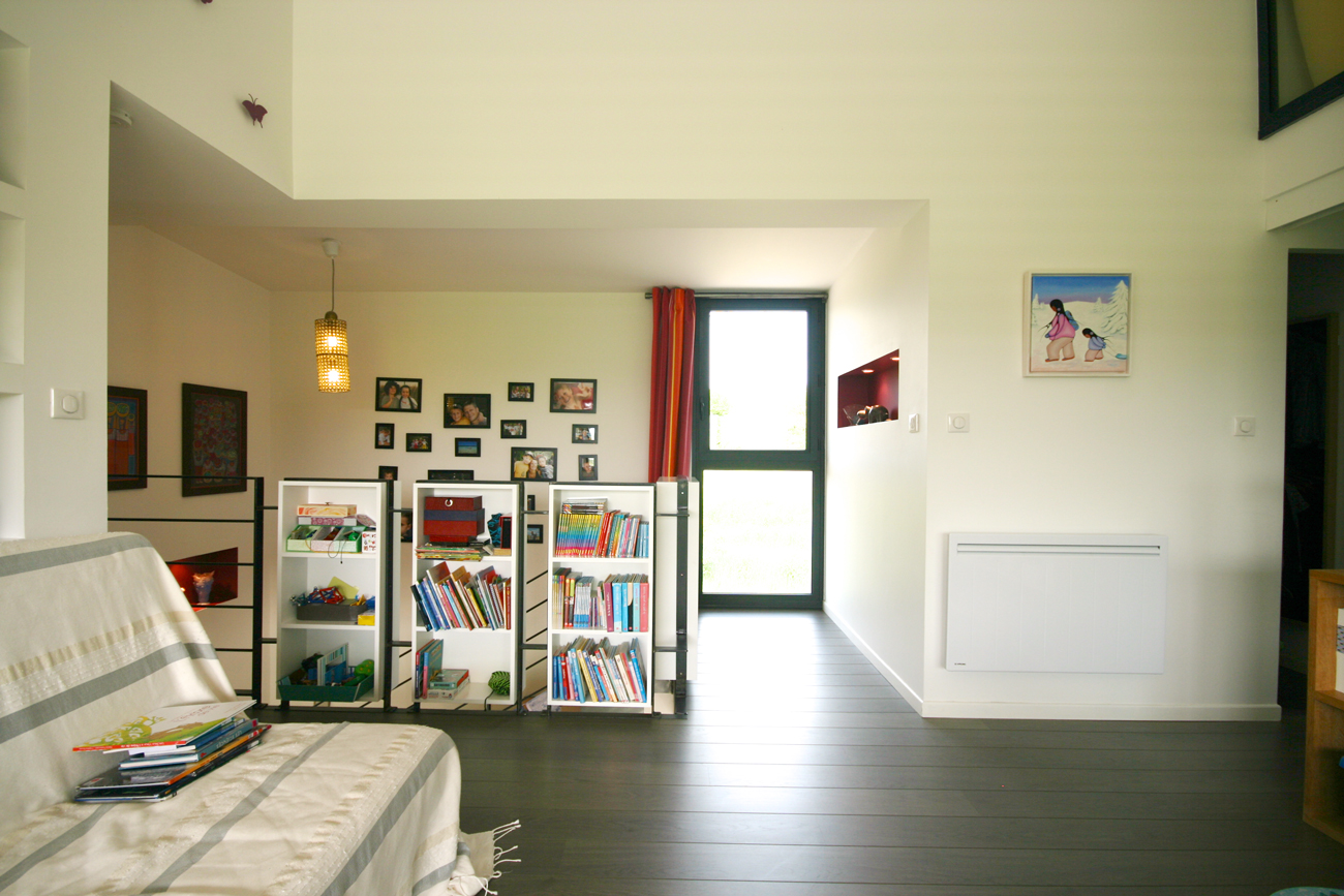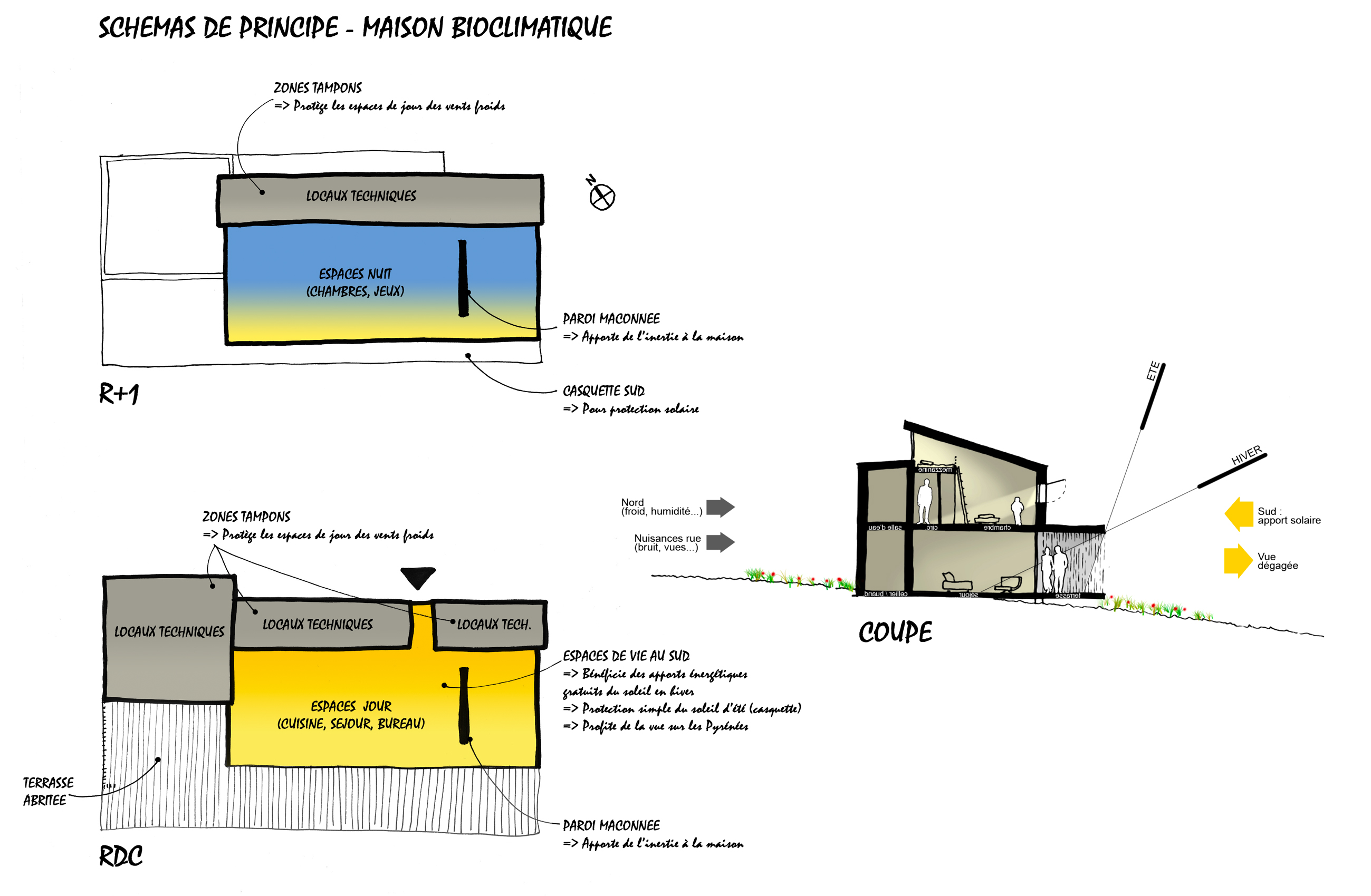 - Au Nord, un premier volume en maçonnerie relativement opaque vient abriter les pièces "techniques" de la maison (cellier, sanitaires, rangements, etc…). Il sert à isoler les pièces de vie des nuisances de la rue et des intempéries du Nord. Il servira également à fournir de l'inertie thermique à l'habitation.